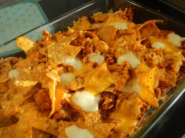 Auf dem Boden einer Auflaufform einige Nacho-Chips (am simpelsten geht es mit "Natur") verteilen und dann etwas Fleisch-Bohnen-Masse darüber geben. Abwechselnd so verfahren, bis alles verbraucht ist. Mit Nachos enden. Geriebenen Cheddar und in Stücke geschnittenen Mozarella großzügig darüber verteilen.